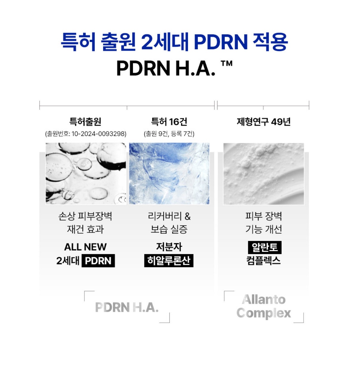 • PDRN Thế hệ Thứ 2 (Đã nộp bằng sáng chế): Đẩy mạnh hiệu quả tái tạo hàng rào da bị tổn thương, giúp da nhanh chóng trở lại trạng thái khỏe mạnh.