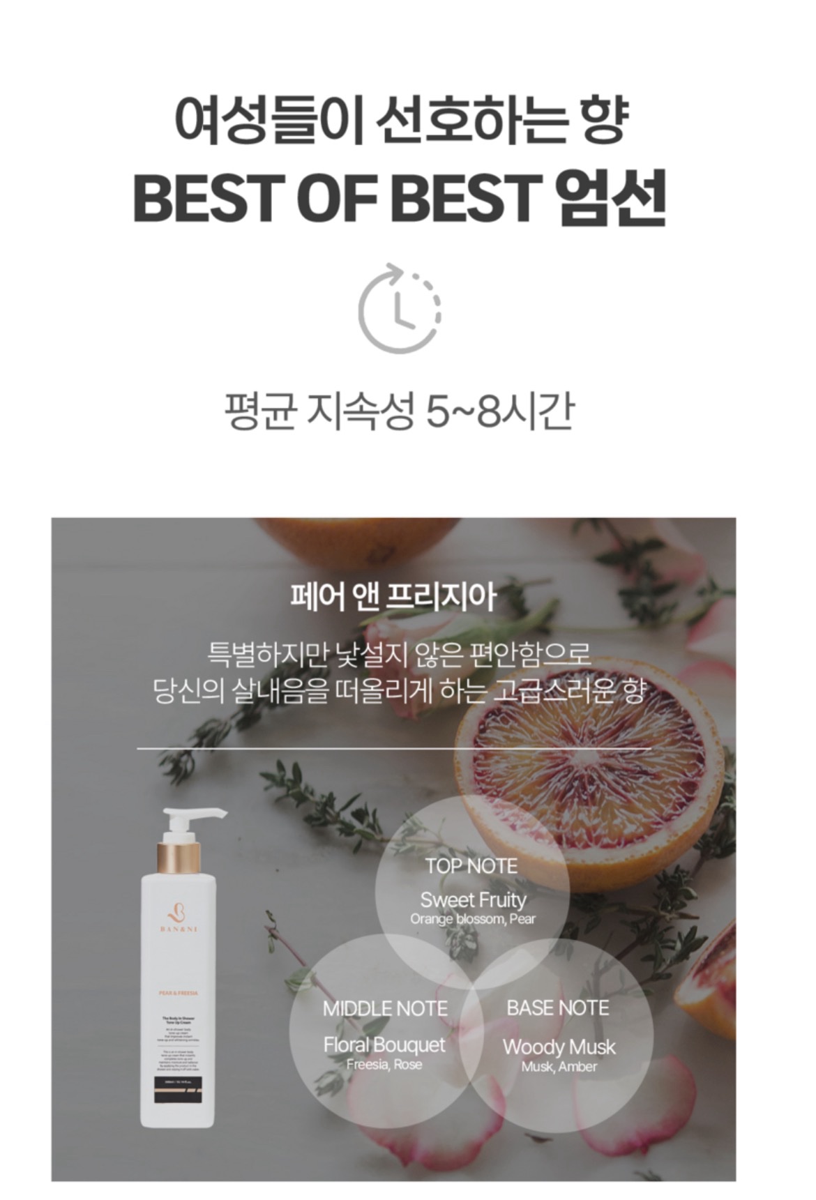 * Hương thơm: Pear & Freesia (Lê và hoa Lan Nam Phi). Đây là sự kết hợp giữa sự tươi mát của trái cây và vẻ sang trọng của hoa cỏ, tạo cảm giác như mùi hương tự nhiên của cơ thể.