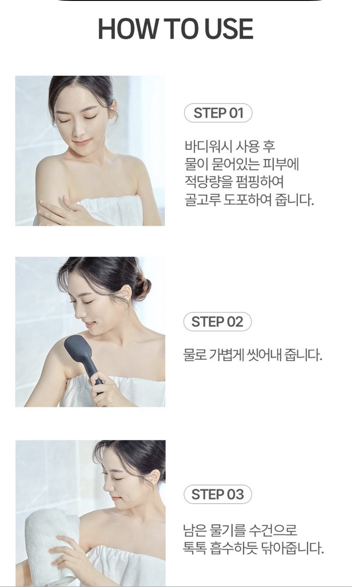 * Bước 1: Sau khi dùng sữa tắm, khi da vẫn còn ướt, lấy một lượng vừa đủ thoa đều lên toàn bộ cơ thể.