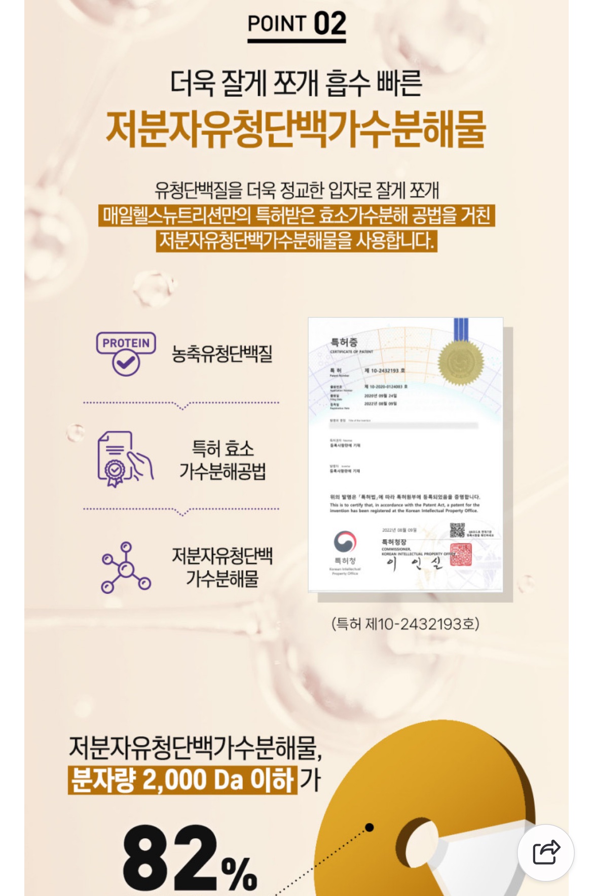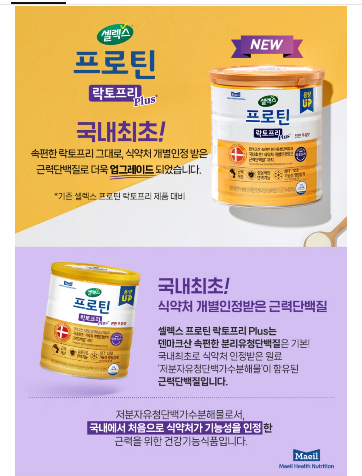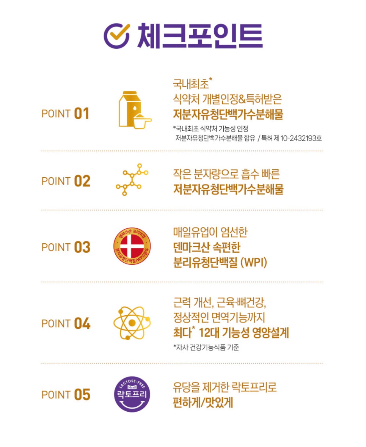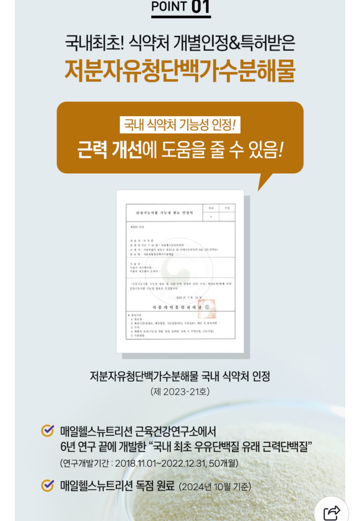 * Tính năng độc quyền: Là loại protein đầu tiên tại Hàn Quốc được Bộ An toàn Thực phẩm và Dược phẩm (MFDS) công nhận tính năng riêng biệt và cấp bằng sáng chế với công dụng: “Có thể giúp cải thiện sức mạnh cơ bắp”.