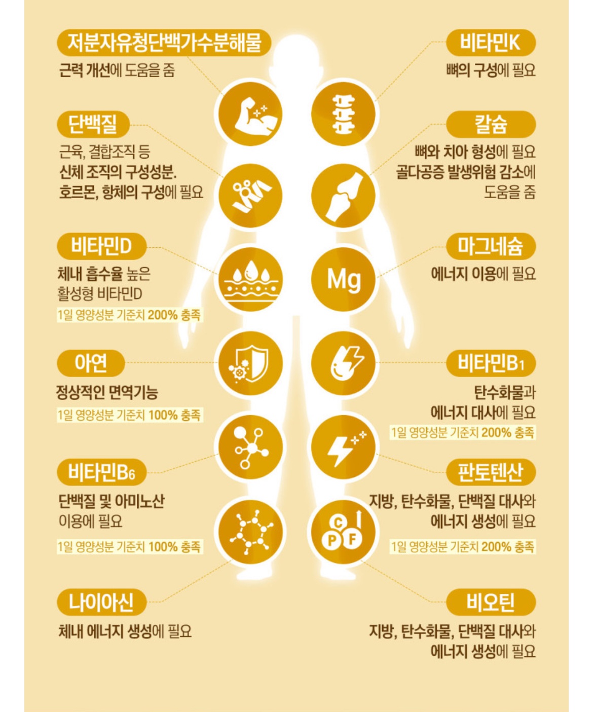 * Loại sản phẩm: Thực phẩm chức năng sức khỏe (Health Functional Food), tập trung vào cải thiện cơ bắp, xương và miễn dịch.